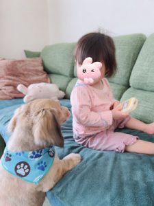 さて、最近動物が大好きな娘ちゃん。テレビやYouTubeで動物が出てくるとめちゃくちゃ喜ぶんです♪なので先週末は、まっちゃんの実家の犬に会ってきました!犬の方が喜んで興奮しちゃって、勢いよくタックルするから娘ギャン泣き(笑)それでもやっぱり気になるようで、最後の方は少しなでなでできました(^^♪犬と子どもがセットだと、なんでこうも癒されるんですかね、ほっこりします♡