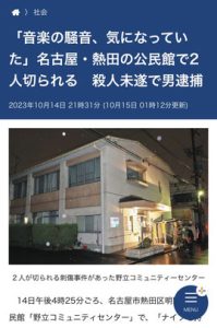 今週は怖いお話です…。先週の14日(土)、お隣の愛知県名古屋市で、公民館で音楽活動に参加していた利用者が刺される事件がありました。容疑者の人は公民館の隣に住んでいて、日頃から歌や楽器の騒音が気になっていた、利用者にもそのことを伝えていたそうです。公民館には子ども達もいたそうで、同じ親としては他人事には思えない事件でびっくりしました…。