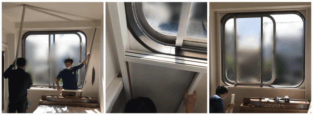 まず、新たに四角い窓枠を製作!Rの窓枠に沿って設置します。ガラスがソノグラス12.8㎜という事もありとても重いので、強度もしっかり考えて、新たな窓枠と壁との間に隙間ができないようしっかり設置。その窓枠の中にプラストの枠を設置します。